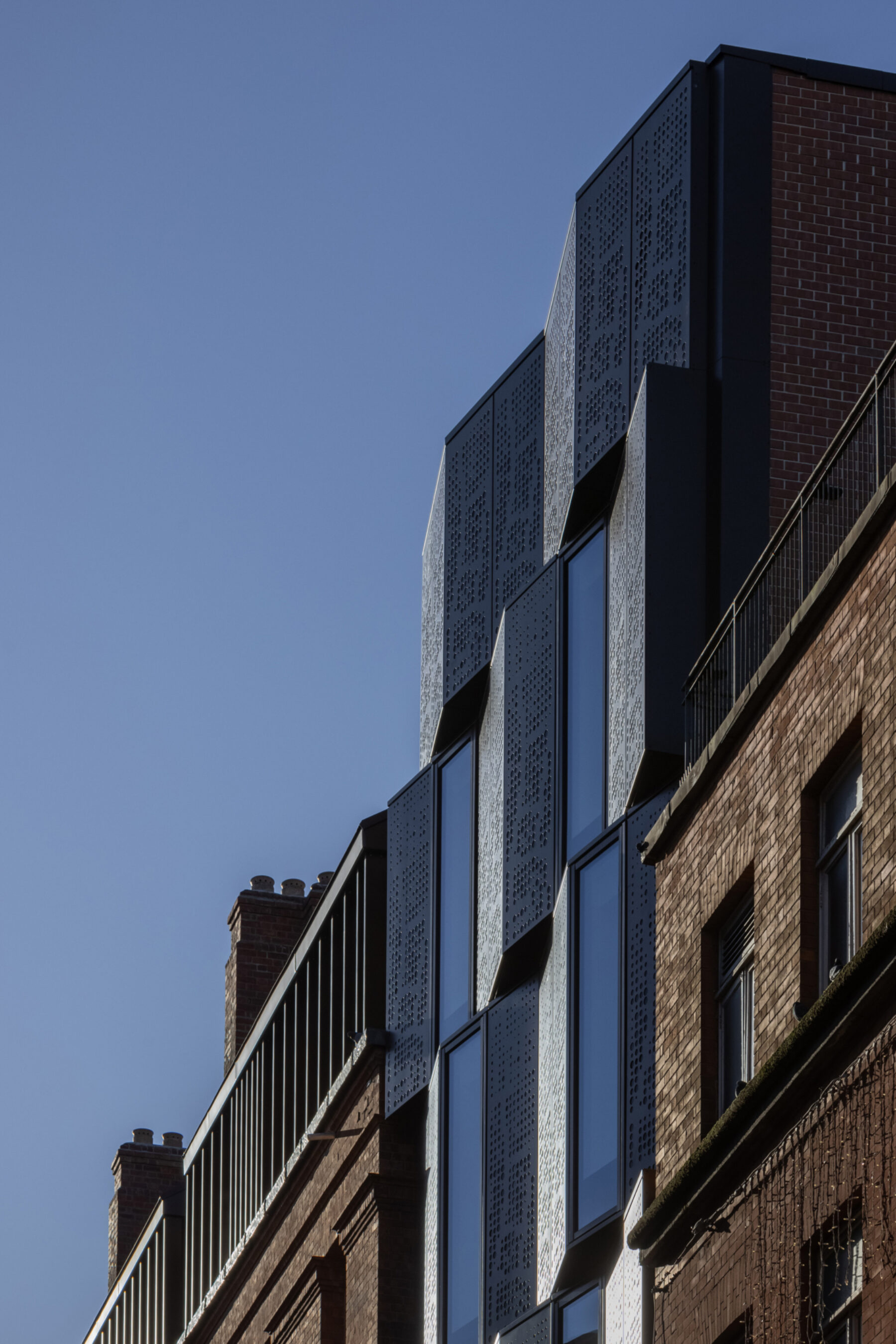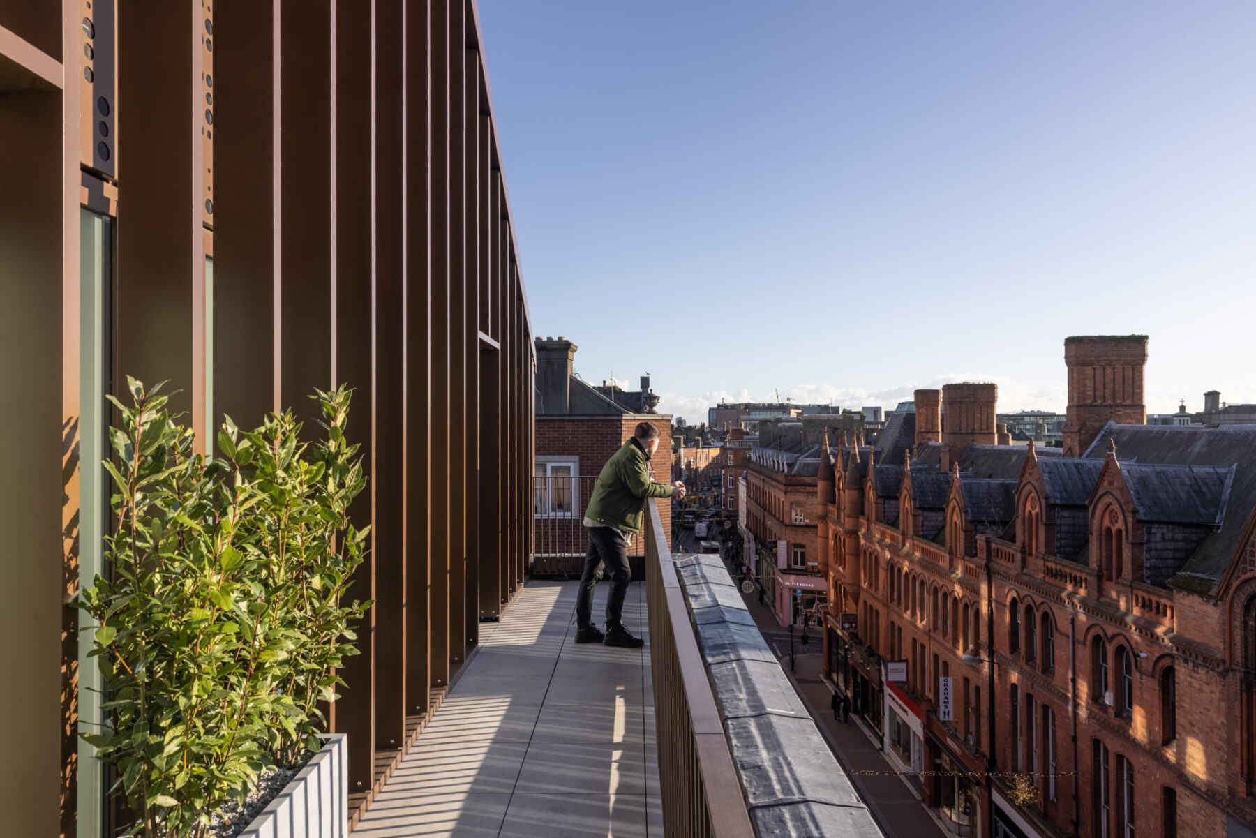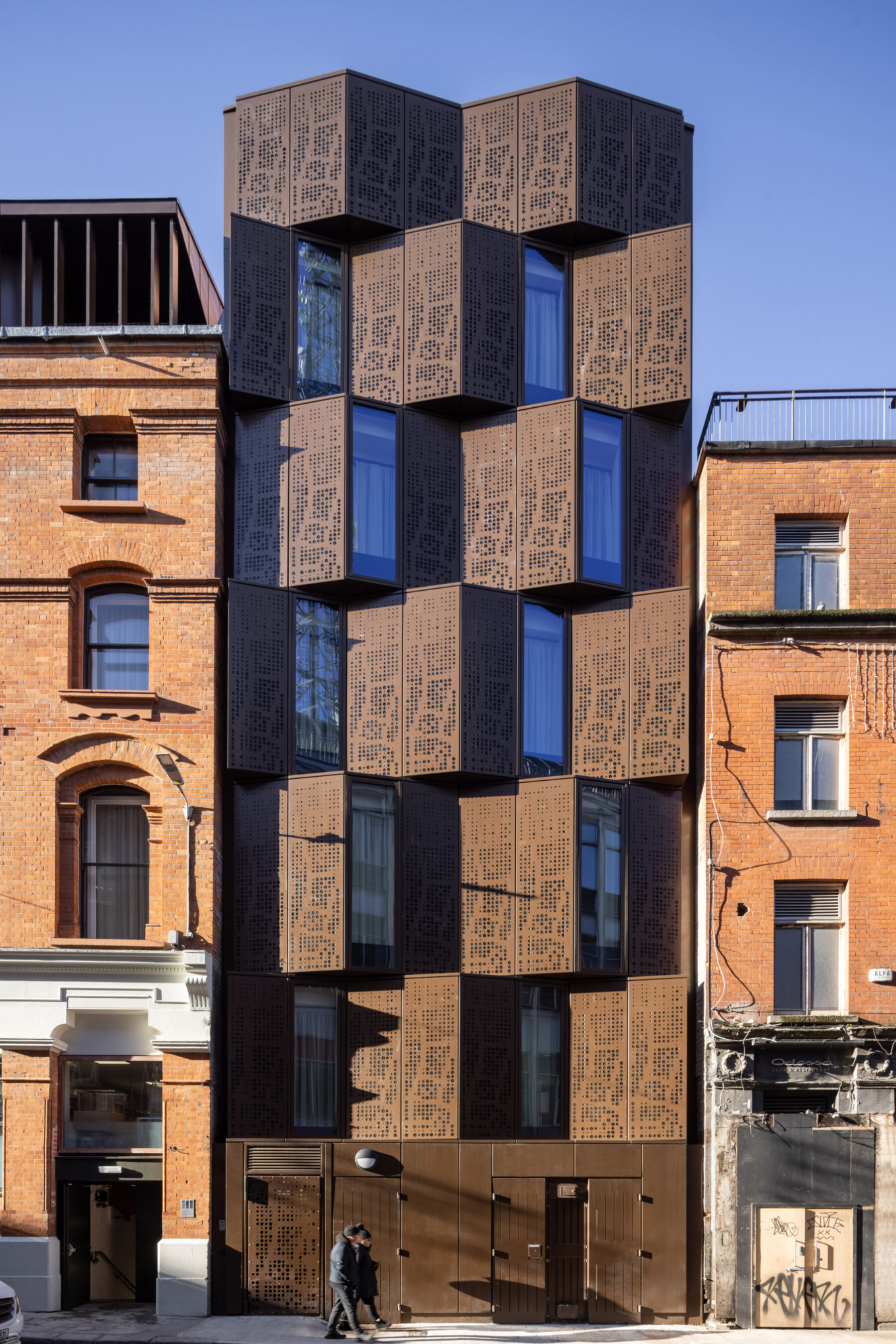 A Dublin institution for almost 150 years, the Central Hotel, with its much-loved Library Bar, re-opens as Hoxton Dublin. Additional accommodation has been carefully grafted to the historic building with a contemporary rooftop extension and a new interconnected building on Dame Court, providing a total of 129 rooms – a mix of original and new. A three storey link bridge connects front and back, facing onto a new courtyard space that will become a green oasis - a new space where the city can let the light in. The main entrance at Exchequer Street has been retained, with many new doors to draw people and light through the building from Georges Street to Dame Court. The panelling of the Dame Court façade is inspired by the corresponding section on John Rocque’s Map of Dublin, 1756. The Library Bar reclaims its place as one of Dublin's favourite spots for a quiet drink or place to meet.